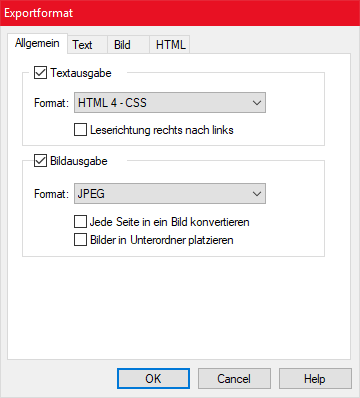 Nutzen Sie dieses Dialogfenster, um grundlegende Einstellungen zu Text- und Bildausgabe beim Export festzulegen.