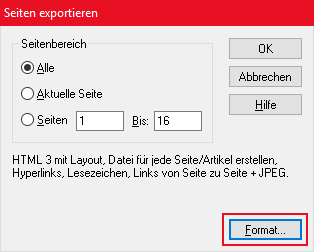 Klicken Sie auf die Schaltfläche Format des Dialogfensters Seiten exportieren (Datei > Exportieren > Seiten als), um zu den allgemeinen Exporteinstellungen zu gelangen: