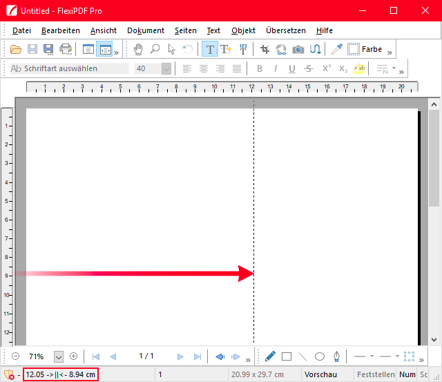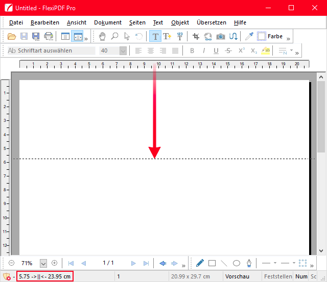 Um eine horizontale Hilfslinie zu erstellen, stellen Sie zuerst sicher, dass das Lineal sichtbar ist (Ansicht > Lineale). Klicken Sie dann in das horizontale Lineal am oberen Rand des Programmfensters und ziehen Sie es nach unten an die gewünschte Position. FlexiPDF fügt dann an dieser Stelle eine horizontale Hilfslinie ein.