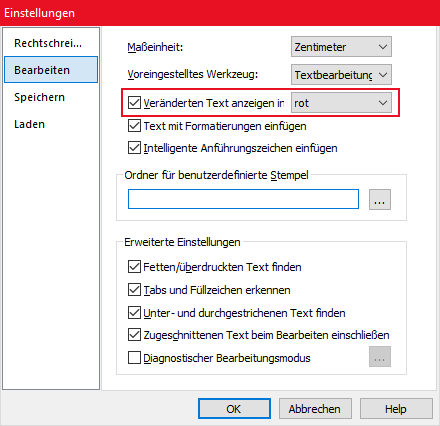 Dokumente bearbeitenÄnderungen verfolgen Änderungen markieren Wählen Sie den Menübefehl Datei > Einstellungen Öffnen Sie die Karteikarte Bearbeiten. Vergewissern Sie sich, dass Veränderten Text anzeigen in ausgewählt ist und wählen Sie eine Farbe aus der Auswahlliste.
