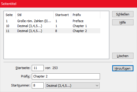 Überschneidet sich die Startnummer mit bereits bestehenden Seitenbezeichnungen, werden die alten Details durch die Neuen überschrieben. Ansonsten wird eine neue Seitenbezeichnung angelegt.