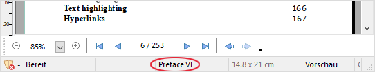 Die FlexiPDF-Statusleiste zeigt die Seitenbezeichnung Preface VI