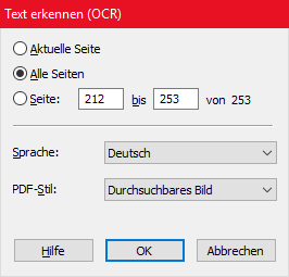 - Wählen Sie Durchsuchbares Bild wenn Sie das Layout der gescannten Seiten erhalten wollen. Der erkannte Text wird dann verborgen, ist aber für die Suche verfügbar. Sollten hierbei Fehler im Erkennungsprozess auftreten, können Sie diese mit den OCR-Korrekturen korrigiert werden.