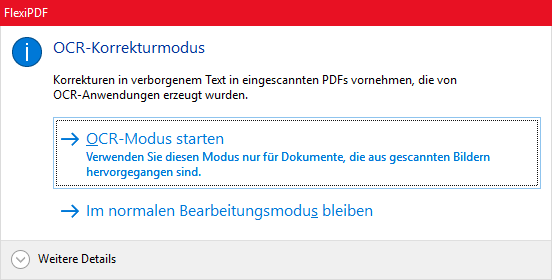 Weil der OCR-Modus ein Dokument substantiell verändern kann, müssen Sie Ihre Auswahl bestätigen. Vergewissern Sie sich stets, dass Sie ein Backup des PDFs besitzen, bevor Sie diesen Modus starten.