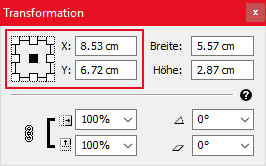 Klicken Sie auf eines der kleinen Quadrate, um es auszuwählen (es wird dann schwarz). Die X- und Y-Werte zeigen dann die Koordinaten des jeweiligen Mittel-, Seiten- oder Eckpunktes an.