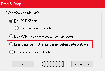 - Alternativ ziehen Sie eine PDF-Datei mit der Maus in das aktuelle Dokumentfenster. Wählen Sie die Option eine Seite des PDFs auf der aktuellen Seite platzieren in dem Fenster aus, das dabei erscheint.