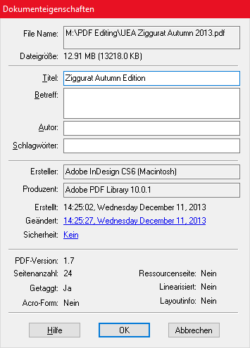 Sie können sich eine Zusammenfassung aller Einstellungen, Datumsangaben, Autoren und anderer Informationen zur aktuellen PDF-Datei mit dem Befehl Dokument > Eigenschaften anzeigen lassen.