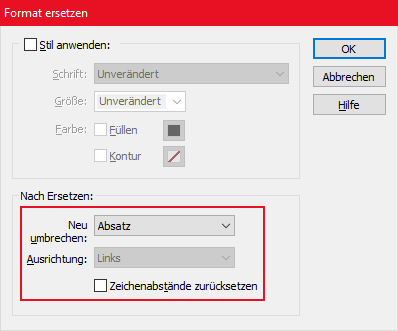 - Klicken Sie im Dialogfenster Suchen und ersetzen auf den Hyperlink Absatz neu umbrechen. Es erscheint das Dialogfenster Format ersetzen.