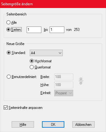 Sie können die Größe einer oder mehrerer Seiten ändern. Dies skaliert (optional) alle Objekte auf der Seite und passt die Media-Box (Papiergröße) an.