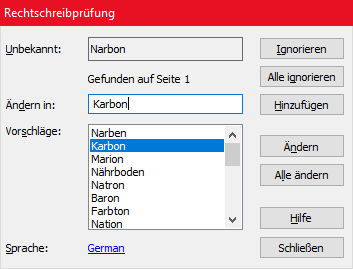 Sie erreichen das Dialogfenster zur Rechtschreibprüfung, indem Sie den Menübefehl Bearbeiten > Rechtschreibung prüfen auswählen oder F7 drücken. Jedes unbekannte Wort wird nicht nur im Dialogfenster angezeigt, sondern auch auf der Seite hervorgehoben.