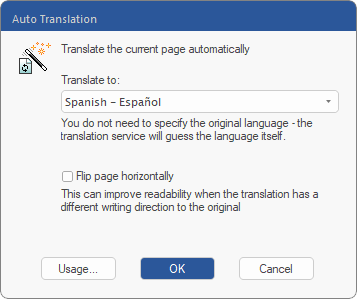 | 4. | If the original and target languages have different writing directions, e.g. English >> Arabic, you can make it easier to read the content by mirroring the page layout. To do so, click on the checkbox Flip page horizontally. Page mirroring works best when the pages have a simple layout. |