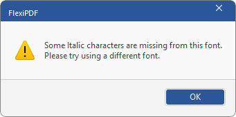 FlexiPDF cannot simulate italic text in the same way as bold text. If a italic variation is not available for the selected characters, FlexiPDF issues the following warning: