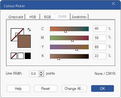 When changing colors, you obtain the highest fidelity when you select the tab that matches the original color system. In the above case, it is best to select a color from the RGB tab because the fill color is already RGB. When you use the CMYK tab, the color values are converted into RGB, which only gives you an approximation of the selected color.