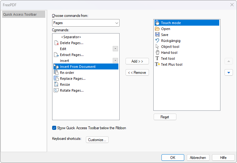 Not only can you customize the default commands for the Quick access toolbar, but you can also choose from all other commands that are available in FreePDF. They can be added to the Quick access toolbar or removed again. To do so, proceed as follows: