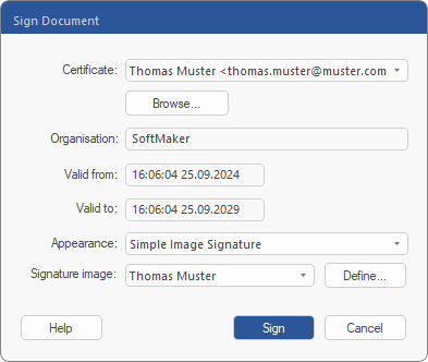 | 7. | Select an entry in the dropdown list Signature image. This is a scanned image of your handwritten signature. If the dropdown list is empty, you can now specify an image file by clicking on Define. For more information, see also Creating signatures. |