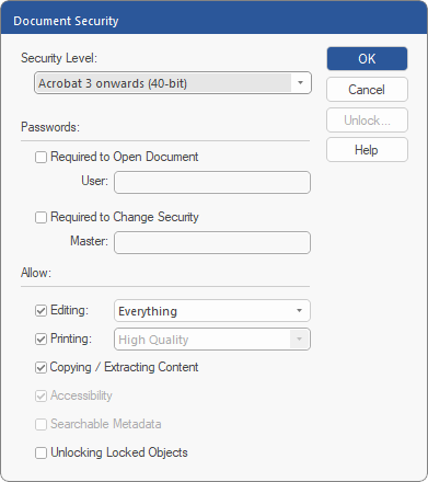 ▪If you select Unlock, you can change the security settings. If the PDF is protected with a Master password, you must enter it now. If you don't know it, you can't change the security settings.