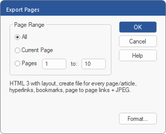 You can export a document either page by page or article by article. (For information on the latter, see Exporting article threads).