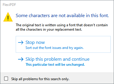 | For fonts in the document, it is important that you select a font which has all the characters (glyphs) required for the replacement. If this is not the case, FlexiPDF will issue a warning during replacement. For more information, see below. |