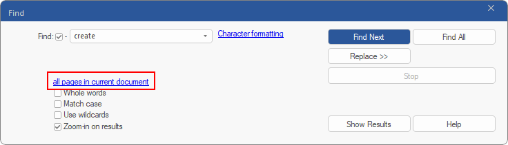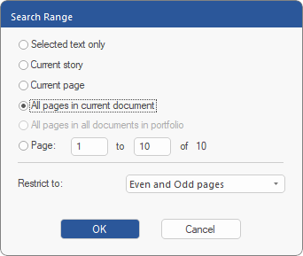 | 3. | To limit the search to specific pages and ranges, click on the hyperlink all pages in current document (highlighted in red in the figure). In the displayed dialog box "Search Range", you can specify the pages in which you want to search. |