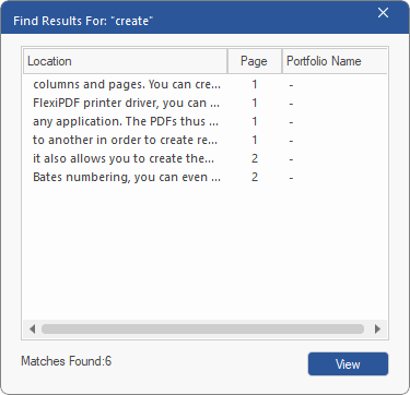 ▪If Zoom-in on results is enabled, FlexiPDF zooms in on the occurrence every time you click on Find Next and selects the text (not available in FreePDF).