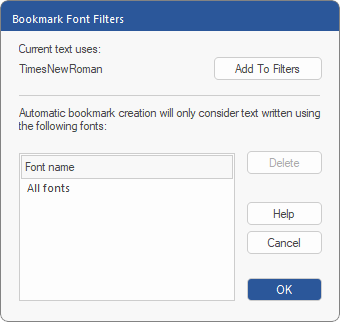 | 6. | Click on Add To Filters to add the font of the selected text to the list. Fonts that are not in the list are ignored during automatic bookmark creation. |
