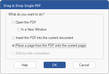 | Alternatively: Drag a PDF file with the mouse into the current document window, and select the option Place a page from the PDF onto the current page in the dialog box that appears: |