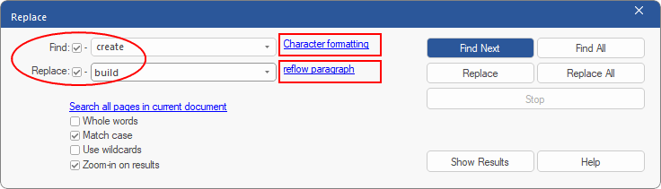 | 2. | In the Find field, define the search term and the desired Character formatting, as described in Finding formatted text. |