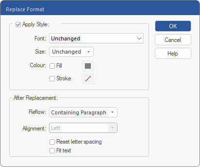 | In the After Replacement section, set how you want the reflow of the text to look after replacement. This is important even if you do not change the text since changing font or font size will require a reflow. The options in this part of the dialog box are described in detail in the Reflow and alignment section. |