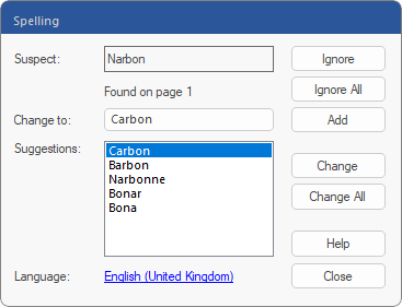 ▪Click on Change to correct the unknown word with the selected suggestion (or double-click on the suggestion). You can also enter the correct spelling yourself in the Change to field if there is no suitable suggestion.