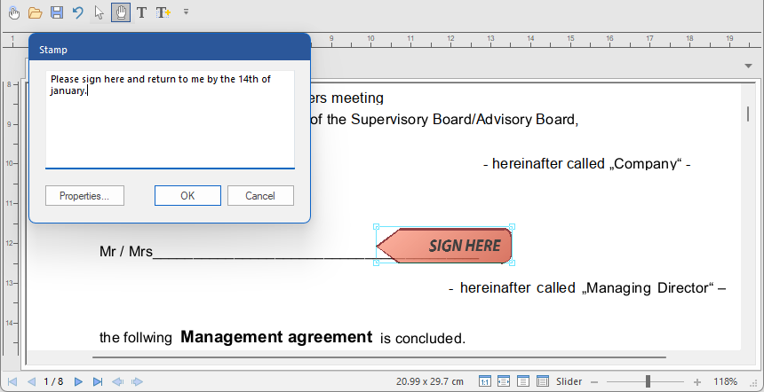 ▪Stamps are printed with the PDF if the check mark is set for "Print annotations" in the dialog box of the command File | Print. However, the contents of the comment window are not printed.