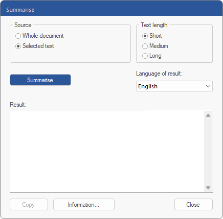 | 3. | Specify the appropriate Text length and the desired language for the output of the summary, and then click on the Summarise button. If you don’t like the summary, press this button again to obtain another result. The previous text will be overwritten. |